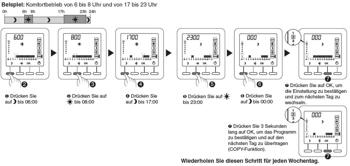 Es ist sinnvoll, sich vorab für jeden Tag das gewünschte Programm, bzw. die gewünschten Zeiten für die Komfort- und die Nachttemperatur aufzuschreiben, damit man durchgehend alle Wochentage programmieren kann.